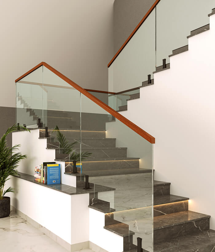 Frameless railings look sophisticated and suit well to any modern and contemporary interior design and architecture. In frameless railings, the support is provided from the base of the railings. The designs are made in such a way that they are very well supported by the firm grip of metal that is used at the base of the railing.